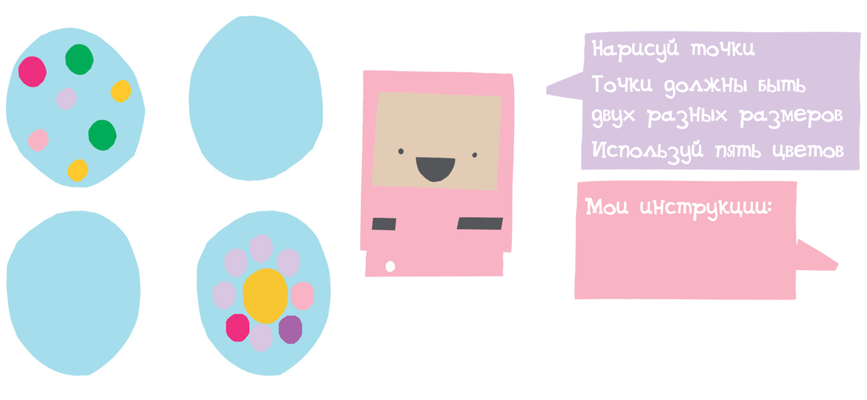 Раскрашивай яйца по инструкции, которую даёт компьютер:  *Нарисуй точки *Точки двух разных размеров *Используй пять цветов